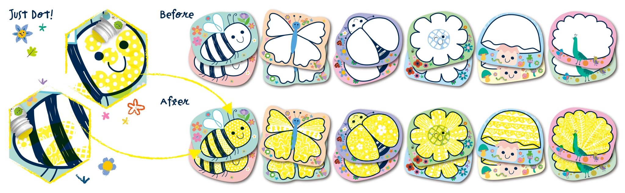 Each set includes 12 themed colouring cards with hidden magic patterns that reveal themselves as kids dot and colour, adding an extra layer of surprise and delight.