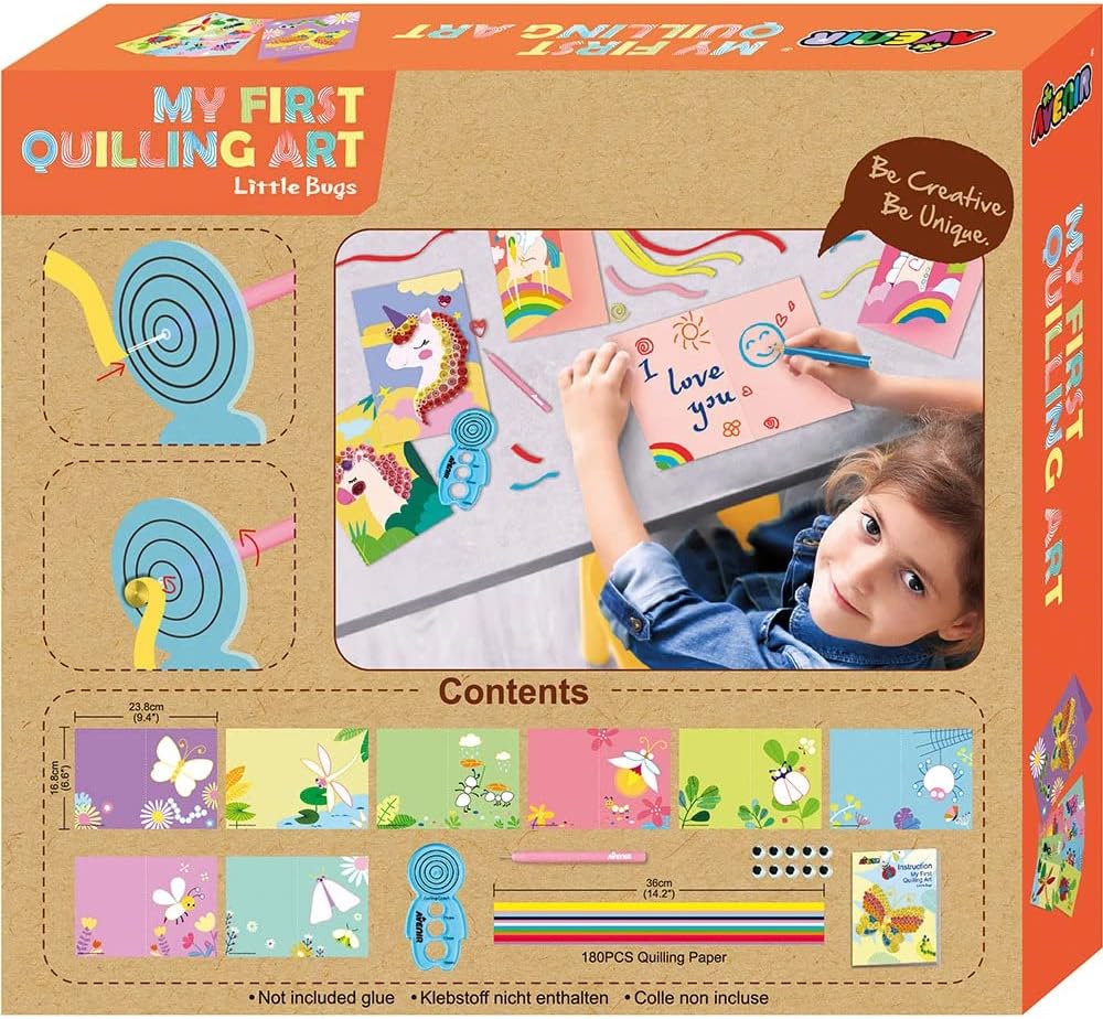 - Contents: 8 different gift cards, 1 roll stencil, 1 quilling pen, 180 quilling papers, 10 craft eyes, 1 instruction manual