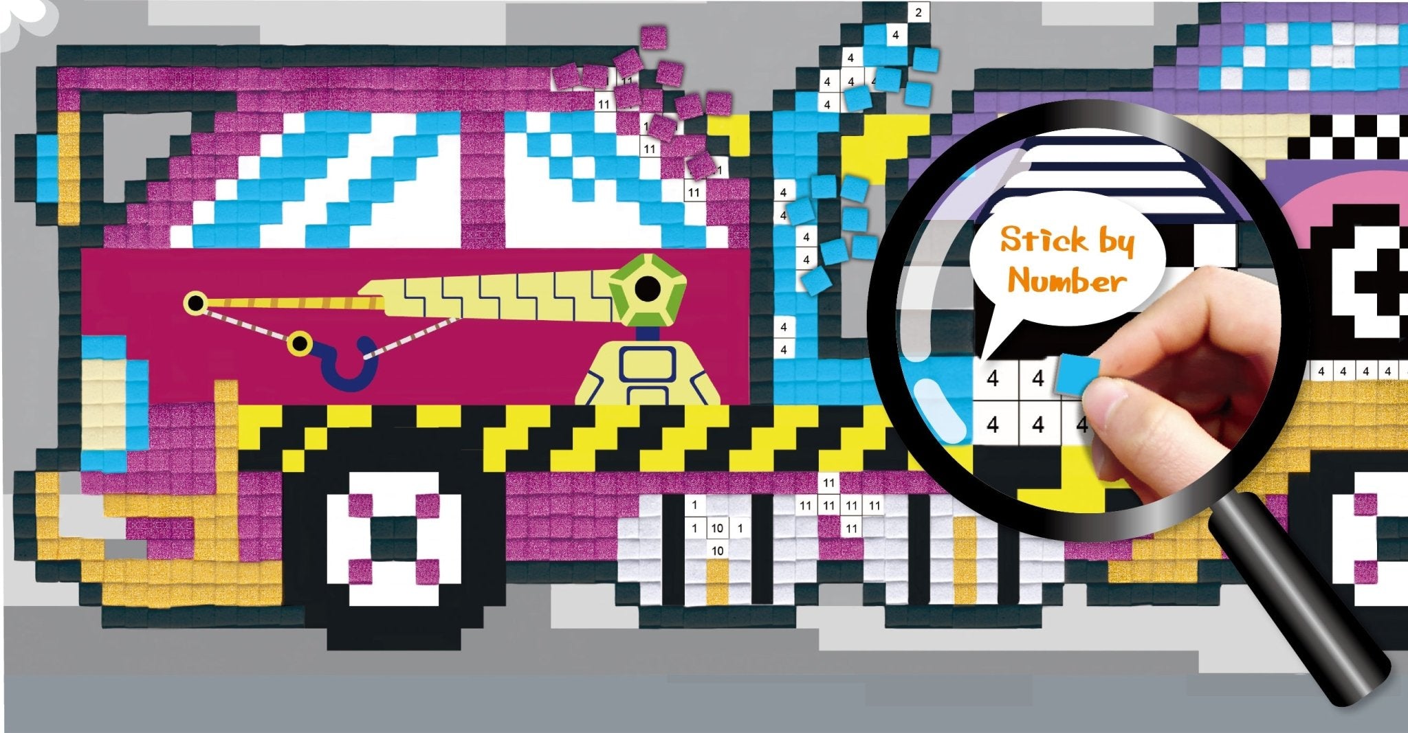 A fun DIY activity for kids 5 and up, this Pixelation Art pack helps improve hands-on skills, coordination, and colour recognition by matching small EVA tile stickers to numbered squares.