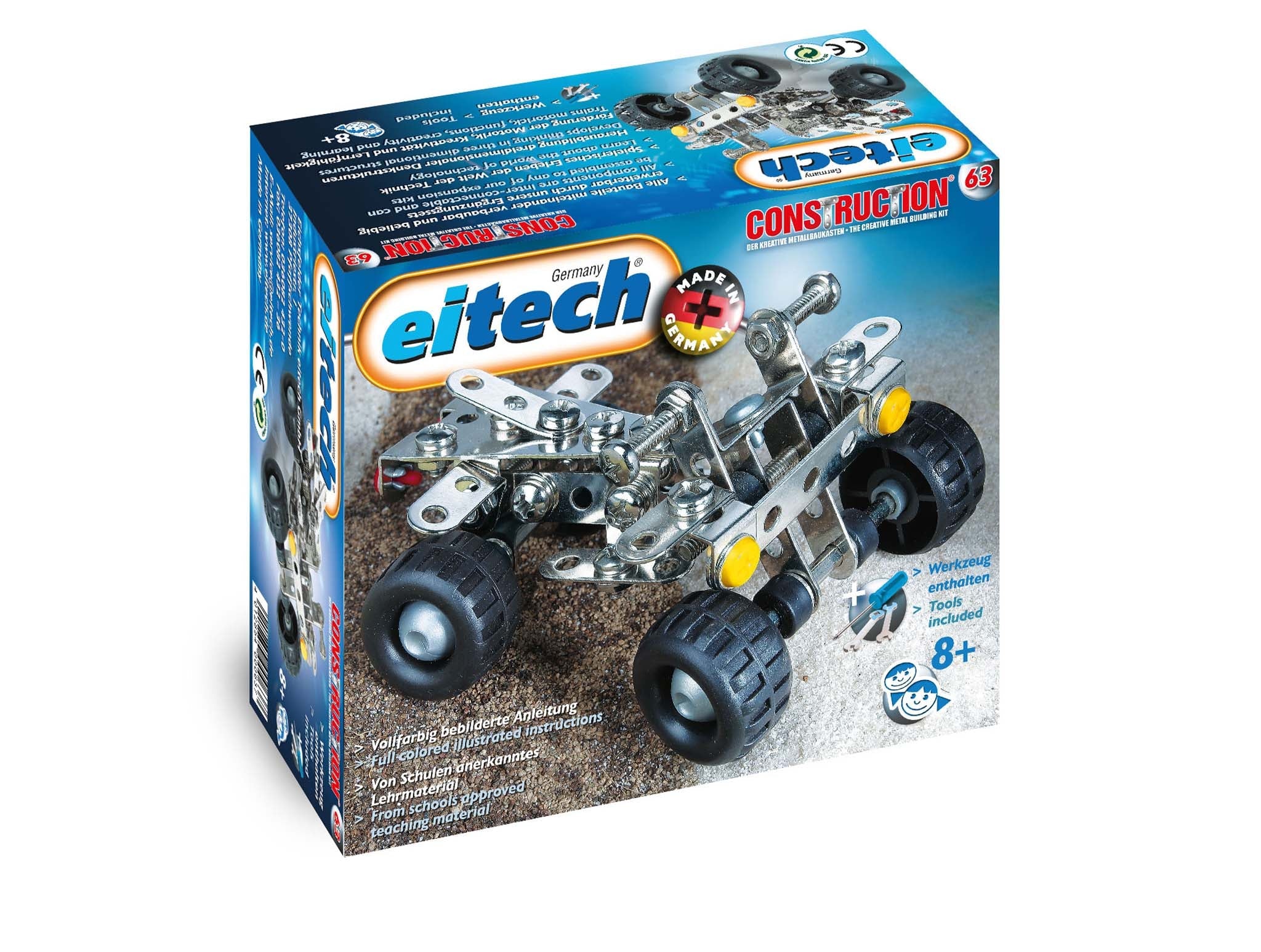 Metal model building sets by Eitech Germany. This quad bike will go over any terrain and at the same time train up their motor skills and learn how to work with tools. Assembly tools and detailed assembly instructions are included with the building set.