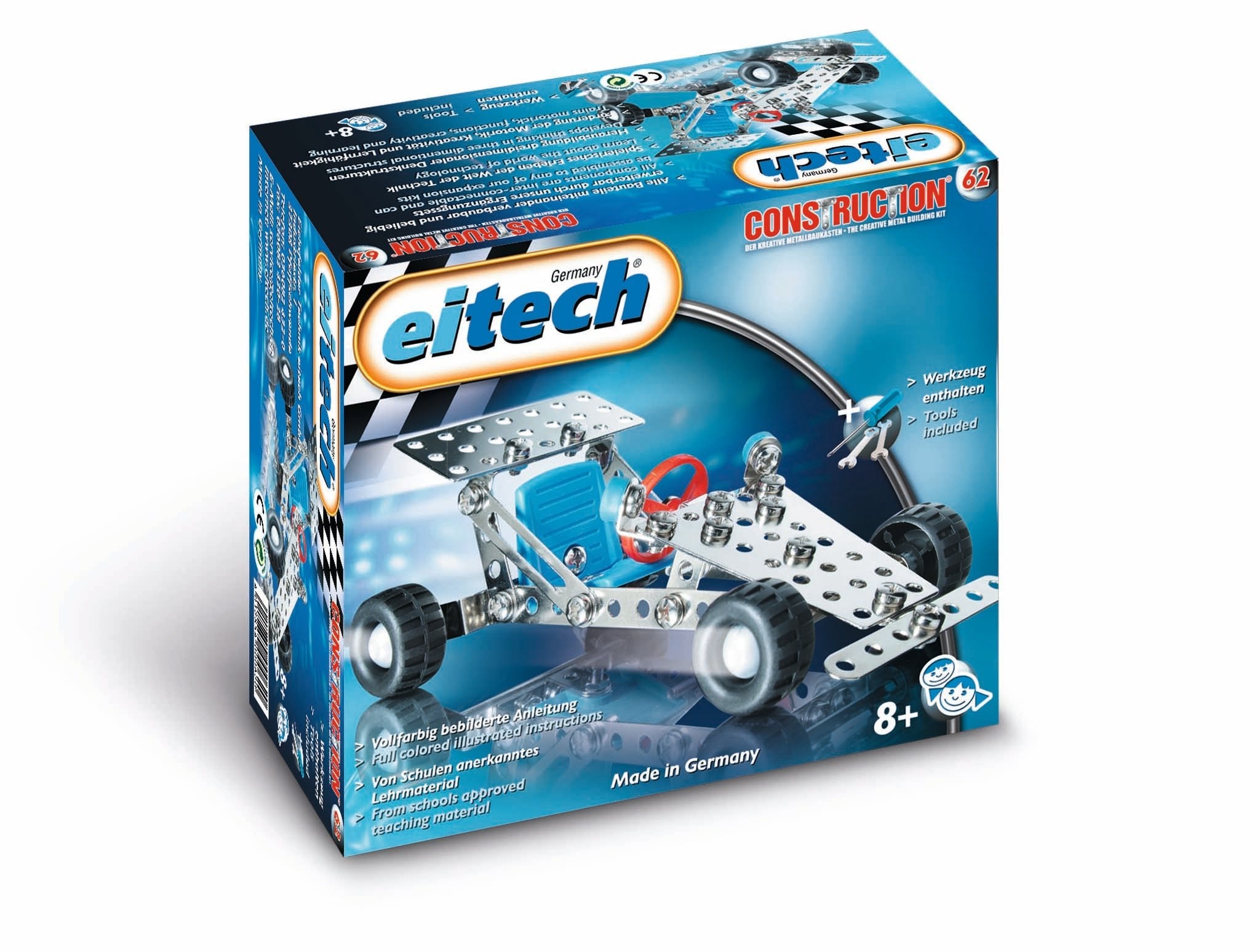 Metal model building sets by Eitech Germany. Fast and powerful, this racing car is the ultimate speed machine. Zoom over any race track and at the same time train up their motor skills and learn how to work with tools. Assembly tools and detailed assembly instructions are included with the building set.